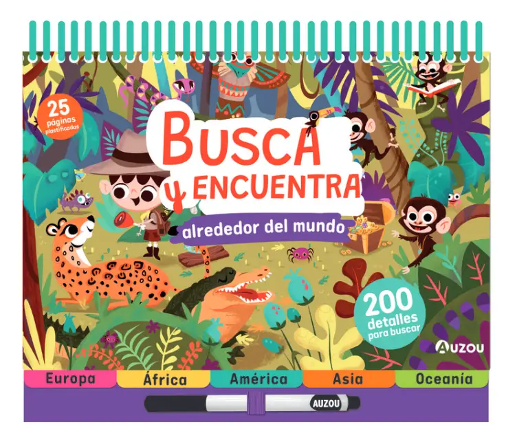 A través de sus coloridas páginas, los niños y niñas viajarán por Europa, África, América, Asia y Oceanía, descubriendo animales, paisajes y culturas mientras buscan más de 200 detalles escondidos. Gracias a su formato con espiral y páginas plastificadas, es ideal para usar una y otra vez, favoreciendo la autonomía y el juego repetitivo.
