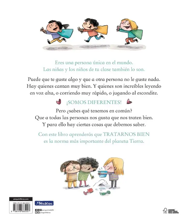 Nos tratamos bien, de la editorial Beascoa y escrito por Lucía Serrano, es un libro educativo que transmite un mensaje claro y esencial: todas las personas somos diferentes, pero todas merecemos respeto y buen trato. A través de situaciones cotidianas y un lenguaje cercano, este cuento ayuda a comprender la importancia de la empatía, la convivencia y el respeto hacia los demás.